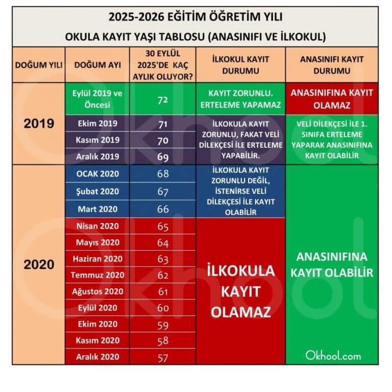 2025 2026 Eğitim Öğretim Yılı Okula Kayıt Yaşı Tablosu